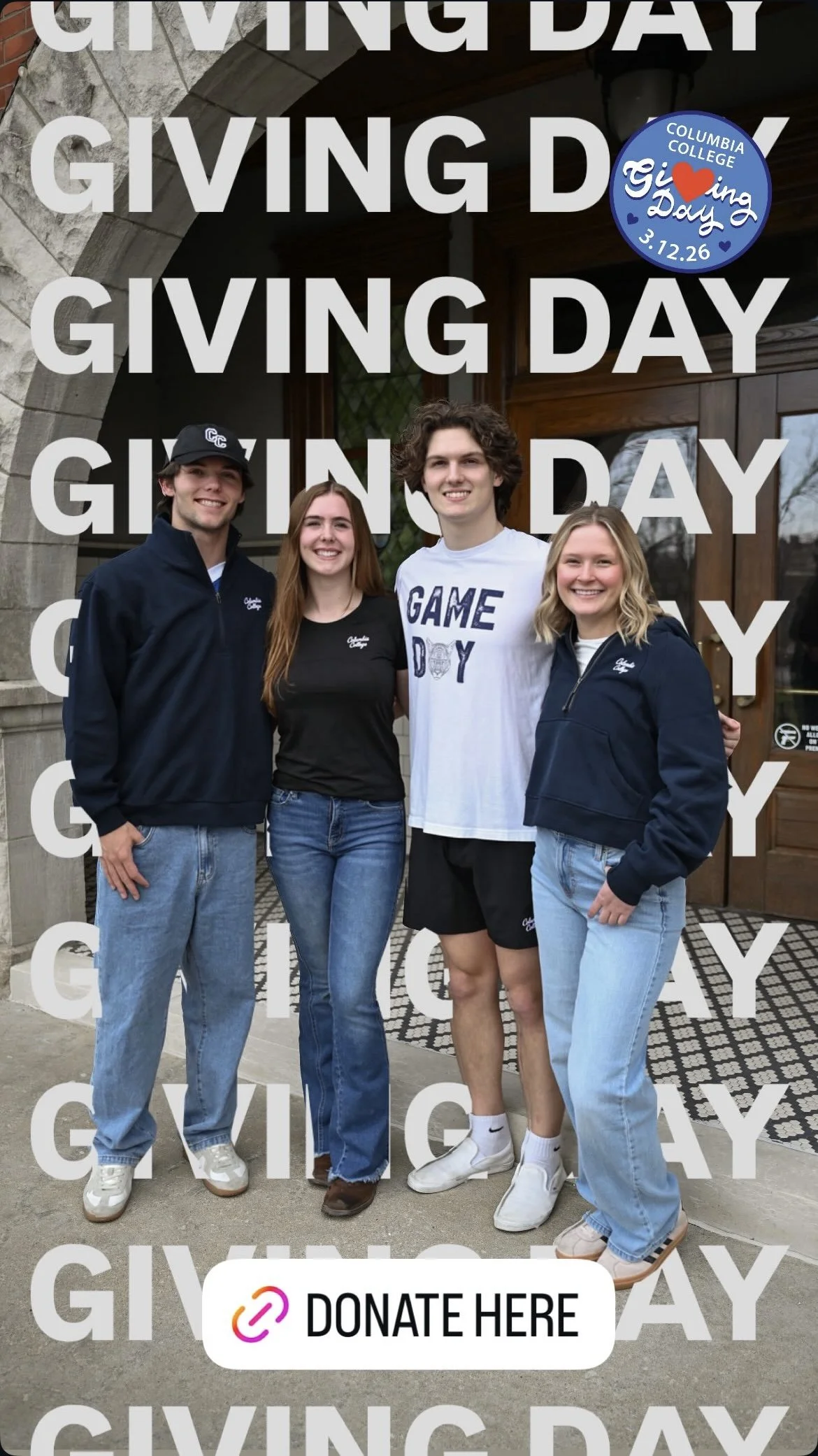 For Columbia College’s Giving Day, I organized and led a student-run campaign, coordinating tasks, assigning projects, and managing the Instagram account in collaboration with the college’s social media team. I oversaw the creation of campaign visuals and designed an Instagram Story posted on Giving Day with a direct link to the campaign site, ensuring a strategic and engaging way for students and followers to participate.