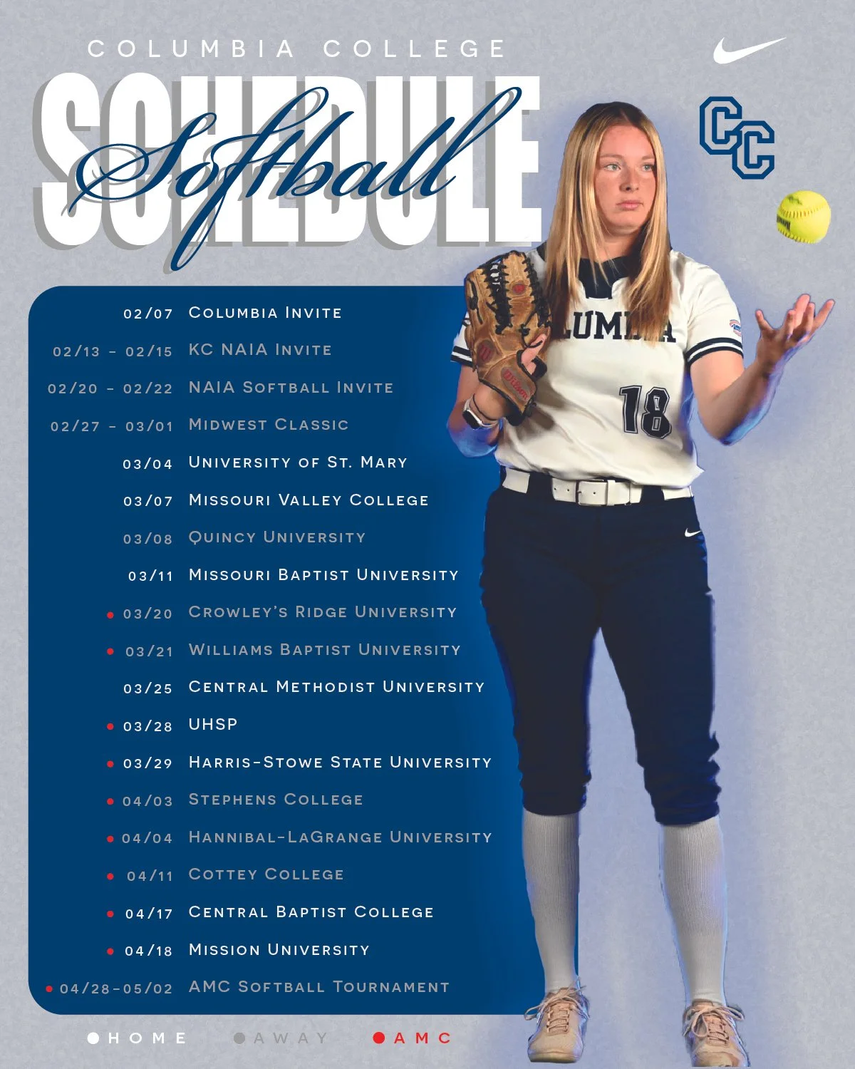For the Columbia College softball team, I created a graphic to share the team’s schedule with viewers. Using an image of a senior pitcher from a gameday media session, I manipulated the photo in Adobe Photoshop to serve as the cover of the schedule post, emphasizing focus and anticipation while highlighting the athlete and the upcoming games.