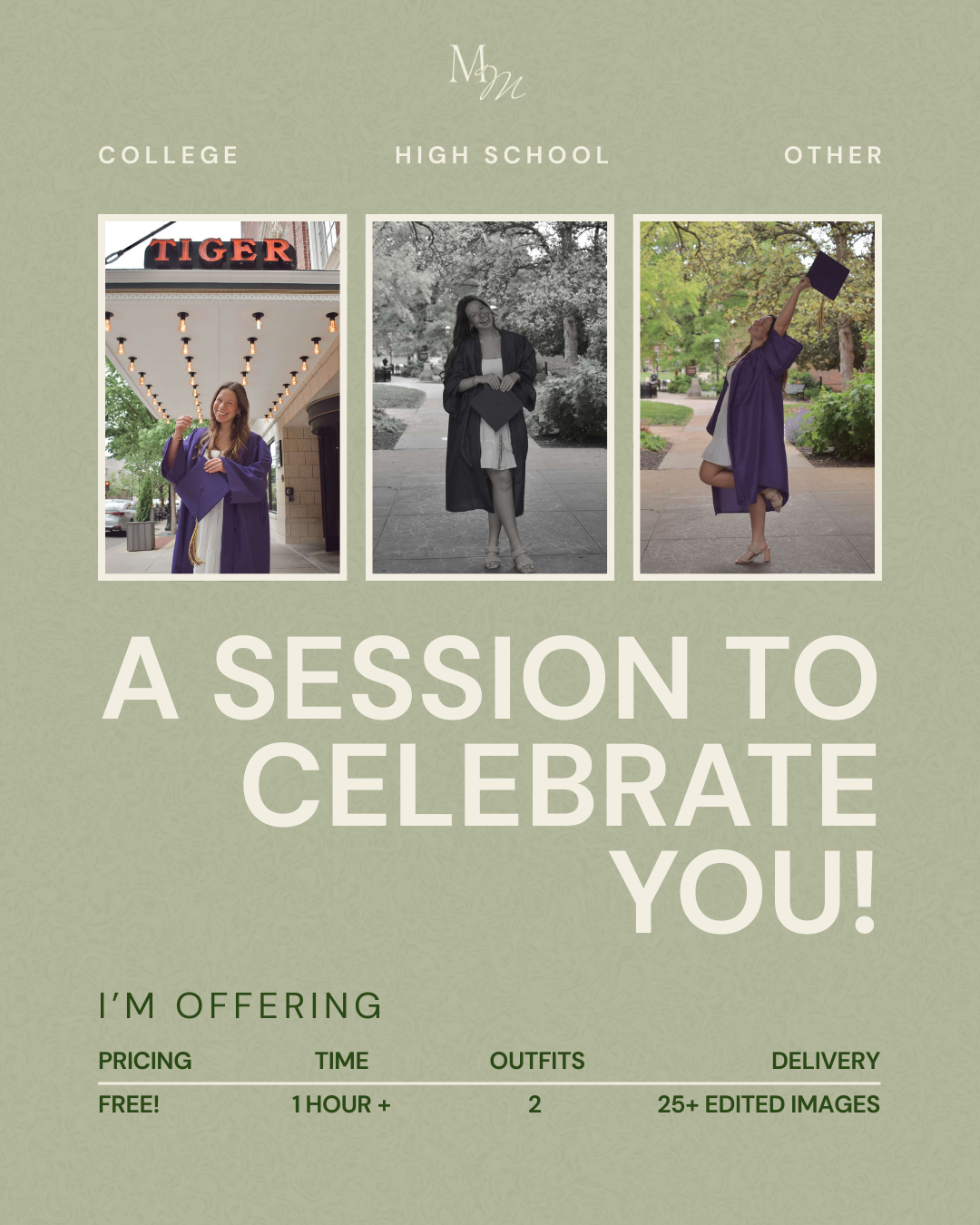 For my personal photography business, I created a carousel graphic to promote a free graduation session and build clientele. The graphic features examples of my previous work alongside my personal branding, including a consistent color palette and logo, to create a professional and engaging presentation that encourages potential clients to book a session.
